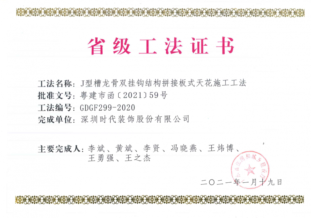 近日,由時代裝飾自主研發的“J型槽龍骨雙掛鉤結構拼接板式天花施工工法”順利通過廣東省住房和城鄉建設廳專家組評審,獲評為廣東省省級工法。