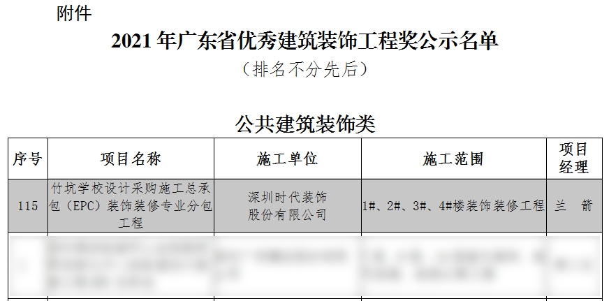 時代裝飾承建的竹坑學(xué)校設(shè)計采購施工總承包(EPC)裝飾裝修專業(yè)分包工程 榮獲2021年廣東省優(yōu)秀建筑裝飾工程獎。