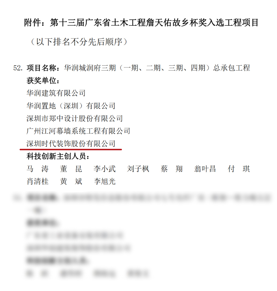 時代裝飾承建的華潤城潤府三期 入選第十三屆廣東省土木工程詹天佑故鄉(xiāng)杯獎工程項目。