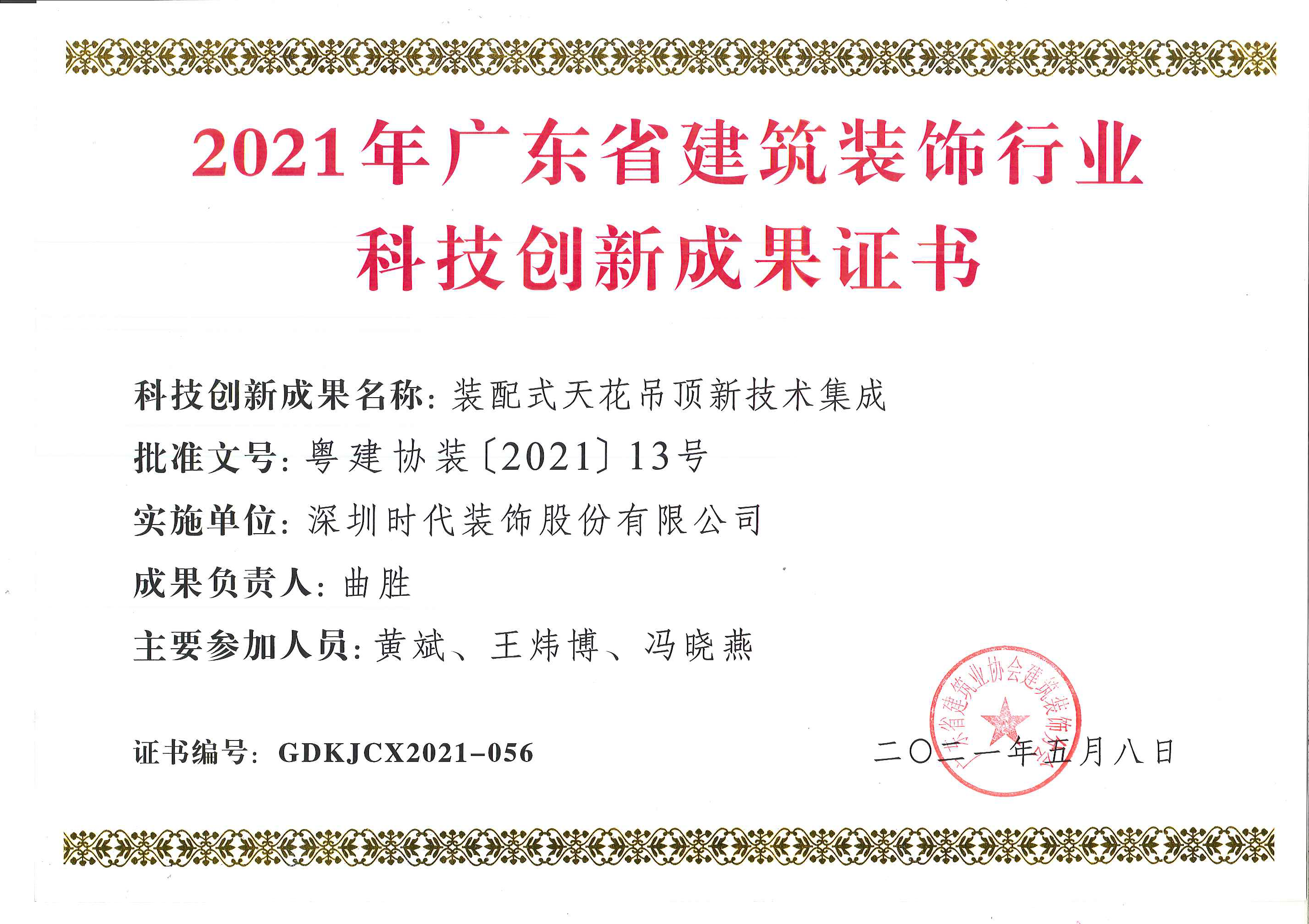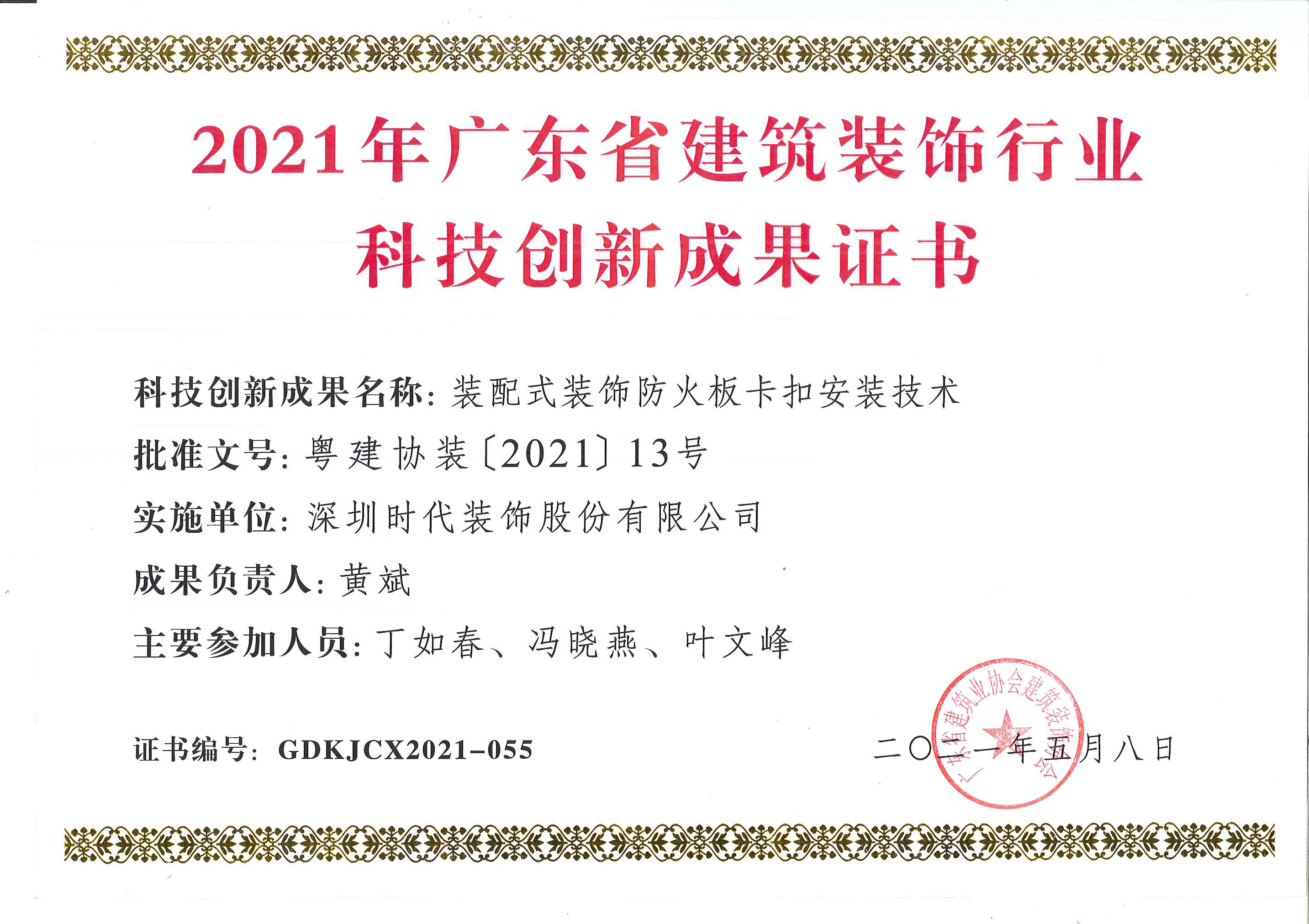時代裝飾承建的茅洲河碧道試點段建設(shè)項目(寶安段)示范段(碧道之環(huán))施工總承包工程及自主研發(fā)的“裝配式天花吊頂新技術(shù)集成”、“J型槽龍骨雙掛鉤結(jié)構(gòu)拼接板式天花施工技術(shù)”、“裝配式裝飾防火板卡扣安裝技術(shù)”,已順利通過廣東省建筑業(yè)協(xié)會建筑裝飾分會評審,正式榮獲2021年廣東省建筑裝飾行業(yè)科技示范工程獎、科技創(chuàng)新成果獎。
