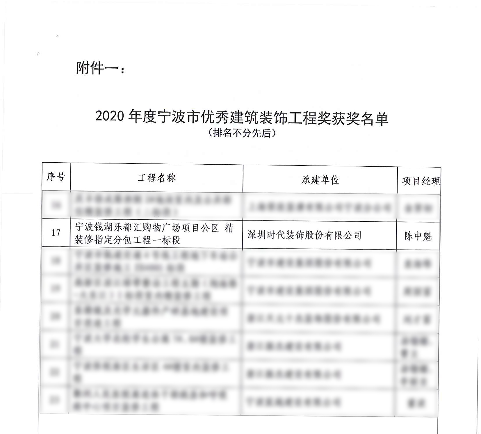 時代裝飾承建的寧波錢湖樂都匯購物廣場項目公區(qū)精裝修指定分包工程一標(biāo)段 榮獲2020年度寧波市優(yōu)秀建筑裝飾工程獎。