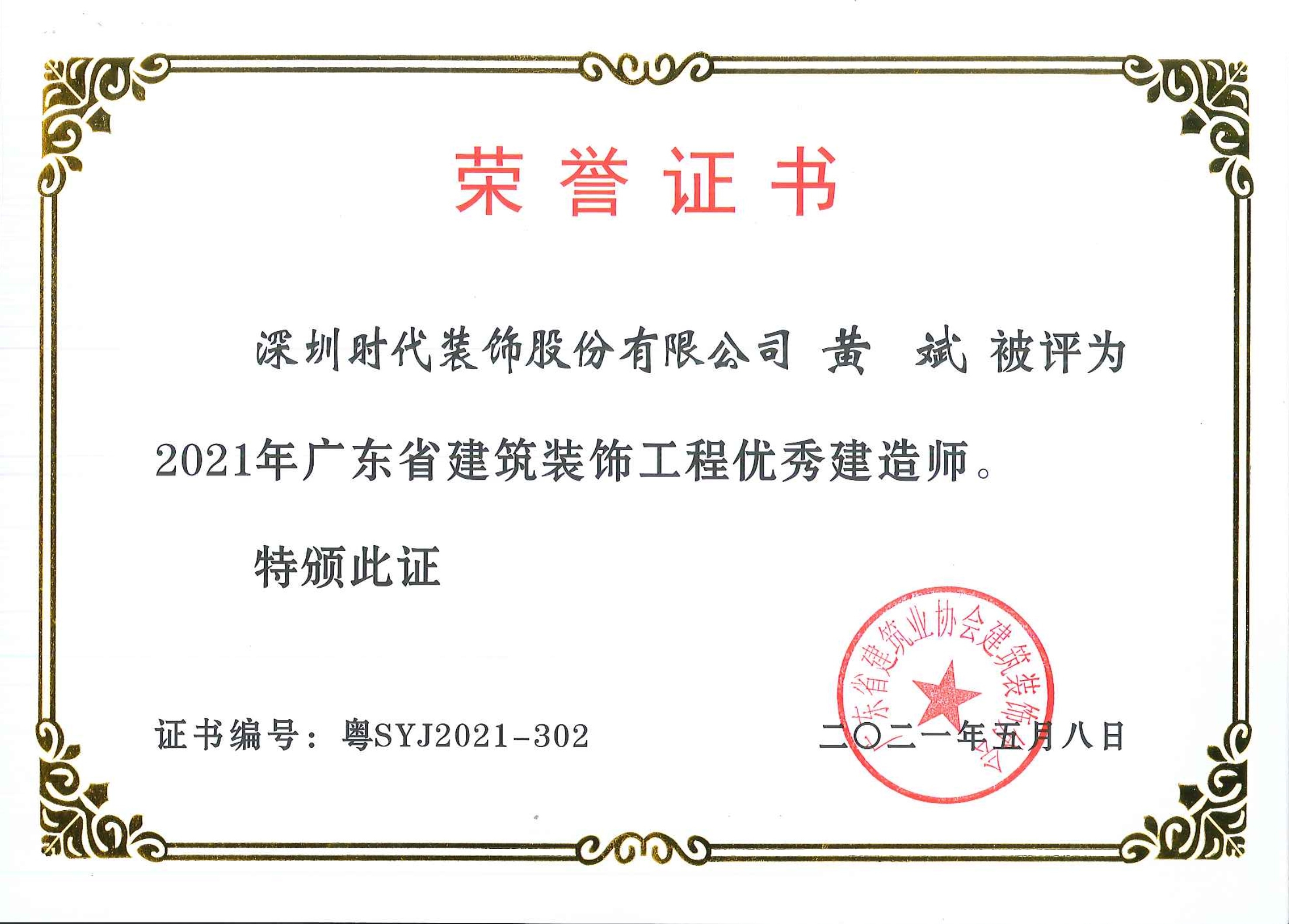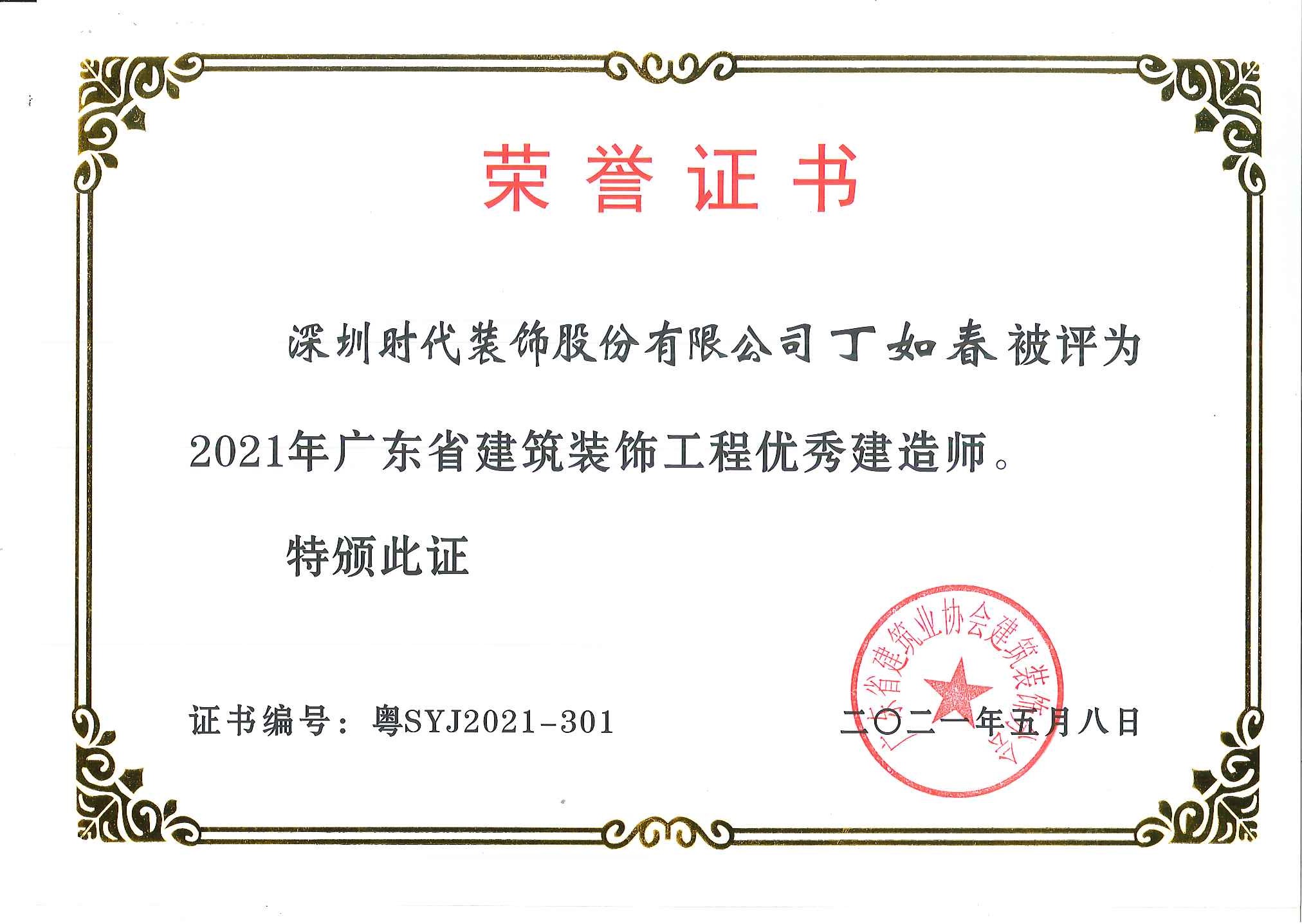 我司丁如春、黃斌被廣東省建筑業(yè)協(xié)會建筑裝飾分會評為2021年廣東省建筑裝飾工程優(yōu)秀建造師稱號。